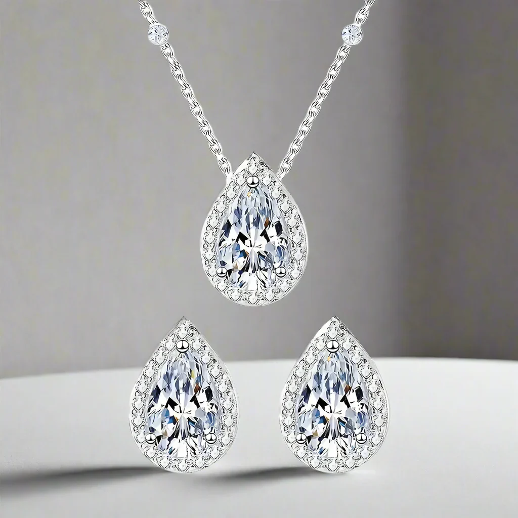 Each piece in the Veronica set is crafted to catch the light from every angle. The pear-shaped centerpiece symbolizes elegance and femininity, while the surrounding stones create a halo of shimmer. It’s a classic look that never goes out of style.